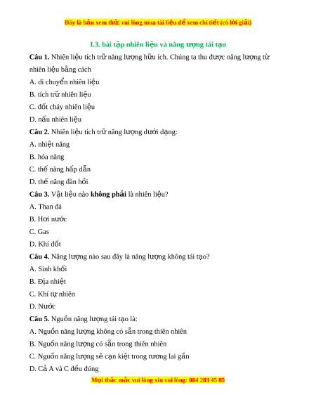 Đây là bản xem th , vu ử i lòng mua tài li u ệ đ xe ể m chi ti t (c ế ó l i ờ gi i ả ) I.3. bài t p n ậ hiên li u và năng ệ ư ng t ợ ái t o ạ Câu 1. Nhiên li u t ệ ích tr năng l ữ ư ng h ợ u í ữ ch. Chúng ta thu đư c ợ năng lư ng t ợ ừ nhiên li u b ệ ng ằ cách A. di chuy n ể nhiên li u ệ B. tích tr nhi ữ ên li u ệ C. đốt cháy nhiên li u ệ D. nấu nhiên li u ệ Câu 2. Nhiên li u t ệ ích tr năng l ữ ư ng d ợ ư i ớ d ng: ạ A. nhiệt năng B. hóa năng C. th năng h ế ấp dẫn D. th năng ế đàn hồi Câu 3. V t ậ li u nào ệ không ph i ả là nhiên li u? ệ A. Than đá B. H i ơ nư c ớ C. Gas D. Khí đốt