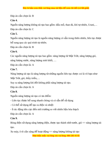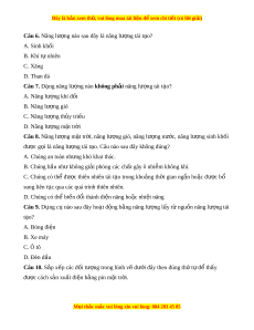 Đây là bản xem th , vu ử i lòng mua tài li u ệ đ xe ể m chi ti t (c ế ó l i ờ gi i ả ) Đáp án c n ch ầ n l ọ à: B Câu 4. Nguồn năng lư ng ợ không tái t o bao g ạ m ồ : d u m ầ , ỏ than đá, khí t nhi ự ên, Urani,… Đáp án c n ch ầ n l ọ à: C Câu 5. Nguồn năng lư ng ợ tái t o l ạ à ngu n năng l ồ ư ng có s ợ n t