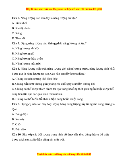 ể ược thiên nhiên tái t o ạ trong kho ng ả th i ờ gian ng n ho ắ c ặ đư c b ợ ổ sung liên t c qua các ụ quá trình thiên nhiên. D. Chúng có th bi ể n đ ế ổi thành đi n năng ệ ho c nhi ặ t ệ năng Câu 9. D ng ụ c nào s ụ au đây ho t ạ đ ng ộ b ng năng l ằ ư ng ợ l y t ấ ngu ừ n năng l ồ ư ng t ợ ái t o? ạ A. Bóng đi n ệ B. Xe máy C. Ô tô D. Đèn d u ầ Câu 10. S p ắ x p các đ ế ối tư ng t ợ rong hình v d ẽ ư i ớ đây theo đúng th t ứ đ ự t ể h y ấ đư c ợ cách s n xu ả ất đi n b ệ ng pi ằ n m t ặ tr i ờ . M i ọ thắc m c