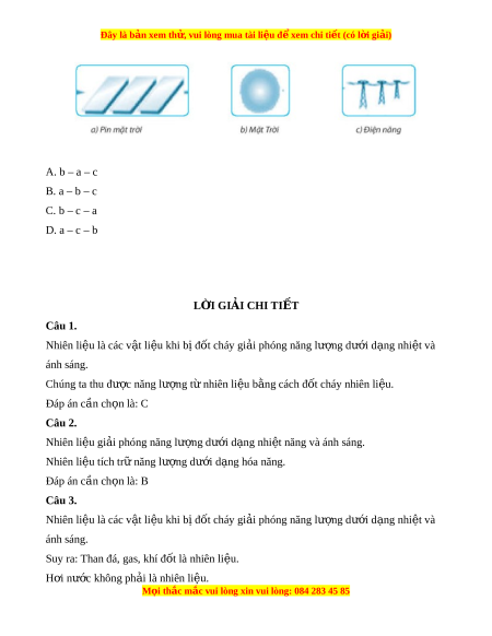 Đây là bản xem th , vu ử i lòng mua tài li u ệ đ xe ể m chi ti t (c ế ó l i ờ gi i ả ) A. b – a – c B. a – b – c C. b – c – a D. a – c – b L I Ờ GIẢI CHI TI T Ế Câu 1. Nhiên li u l ệ à các v t ậ li u khi ệ b đ ị t ố cháy gi i ả phóng năng lư ng d ợ ư i ớ d ng nhi ạ t ệ và ánh sáng. Chúng ta thu đư c năng l ợ ư ng ợ t nhi ừ ên li u b ệ ng cách ằ đ t ố cháy nhiên li u. ệ Đáp án c n ch ầ n l ọ à: C Câu 2. Nhiên li u gi ệ i ả phóng năng lư ng d ợ ư i ớ d ng ạ nhi t ệ năng và ánh sáng. Nhiên li u t ệ ích tr năng l ữ ư ng d ợ ư i ớ d ng hóa năng. ạ Đáp án c n ch ầ n l ọ à: B Câu 3. Nhiên li u l ệ à các v t ậ li u khi ệ b đ ị t ố cháy gi i ả phóng năng lư ng d ợ ư i ớ d ng nhi ạ t ệ và ánh sáng.