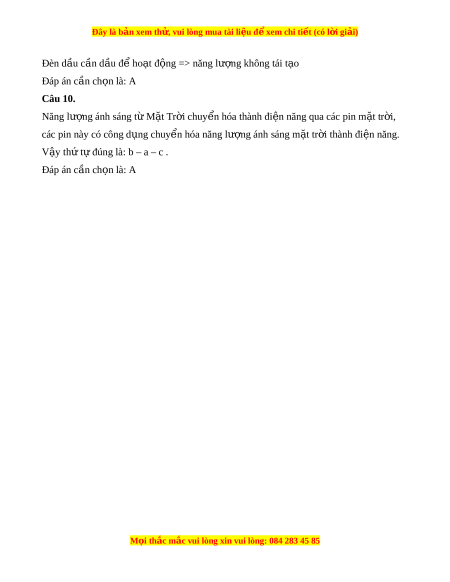 ổ ung nhanh chóng và có s n đ ẵ s ể ử d ng ụ - Có th s ể d ử ng đ ụ t ể o ạ ra đi n và nhi ệ t ệ - Ít tác đ ng t ộ iêu c c đ ự n ế môi trư ng s ờ o v i ớ nhiên li u hóa t ệ h ch ạ Đáp án c n ch ầ n l ọ à: A Câu 9. Bóng đi n s ệ d ử ng năng l ụ ư ng ợ đi n, đ ệ ư c t ợ o ạ thành nh n ờ ư c, gi ớ ó => năng lư ng ợ tái t o. ạ Xe máy, ô tô c n xăng ầ đ ho ể t ạ đ ng => năng l ộ ư ng ợ không tái t o ạ M i ọ thắc m c