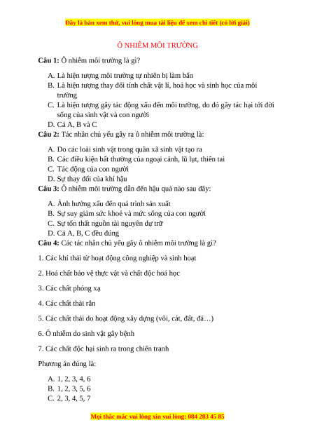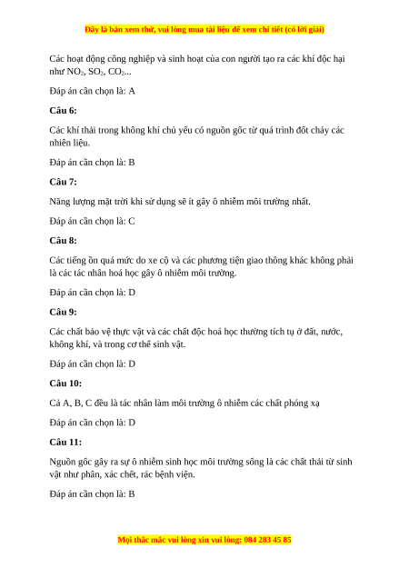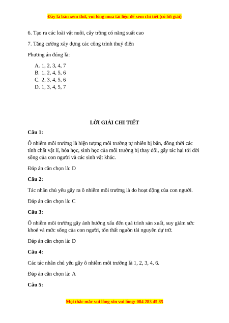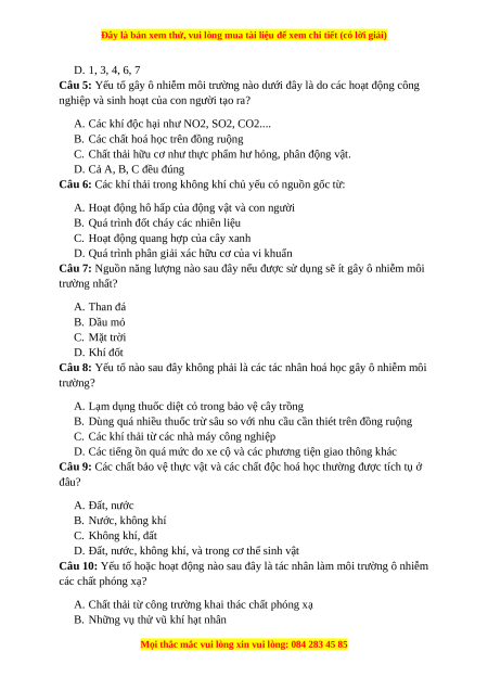 Các tác nhân chủ yếu gây ô nhiễm môi trường là 1, 2, 3, 4, 6. Đáp án cần chọn là: A Câu 5: