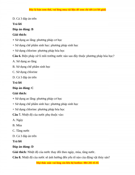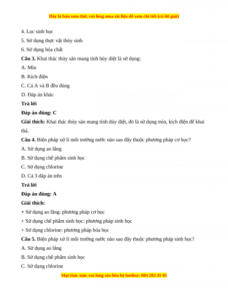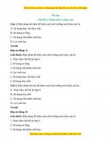 Câu 5. Biện pháp xử lí môi trường nước nào sau đây thuộc phương pháp sinh học? A. Sử dụng ao lắng