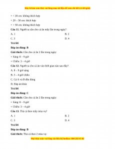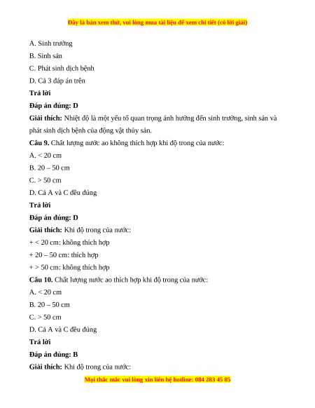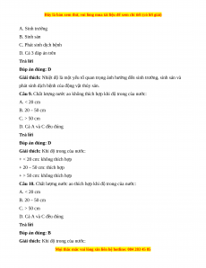 Câu 9. Chất lượng nước ao không thích hợp khi độ trong của nước: A. < 20 cm B. 20 – 50 cm C. > 50 cm D. Cả A và C đều đúng Trả lời Đáp án đúng: D