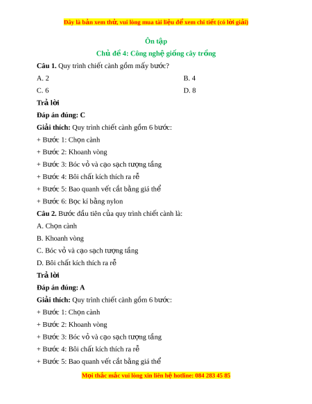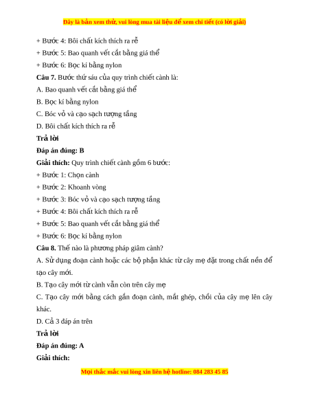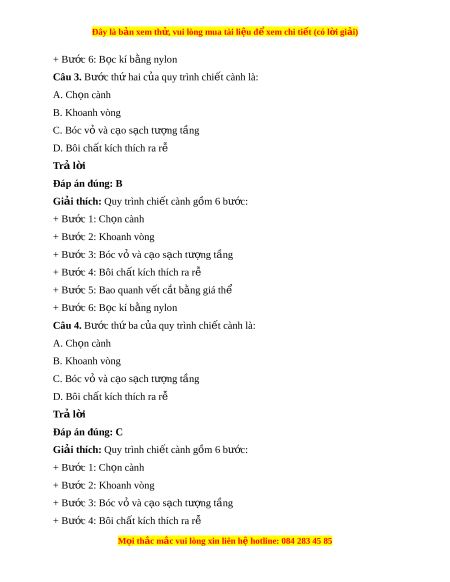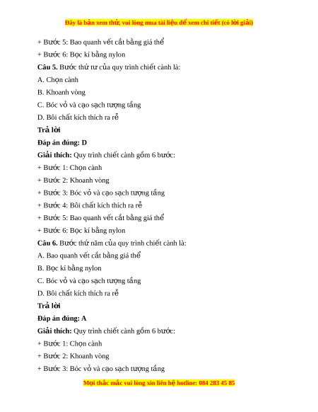 Đây là bản xem th , vu ử i lòng mua tài li u ệ đ xe ể m chi ti t (c ế ó l i ờ gi i ả ) + Bư c 5: ớ Bao quanh v t ế c t ắ b ng gi ằ á thể + Bư c 6: ớ B c ọ kí b ng nyl ằ on Câu 5. Bư c t ớ h t ứ c ư a ủ quy trình chi t ế cành là: A. Ch n cành ọ B. Khoanh vòng C. Bóc vỏ và c o s ạ ch ạ tư ng t ợ ng ầ D. Bôi ch t ấ kích thích ra rễ Trả l i ờ Đáp án đúng: D
