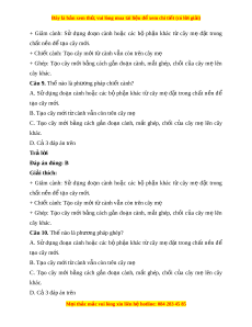 Giải thích: Quy trình chi t ế cành g m ồ 6 bư c: ớ + Bư c 1: ớ Ch n ọ cành + Bư c 2: ớ Khoanh vòng + Bư c 3: ớ Bóc v và c ỏ o ạ s ch ạ tư ng t ợ ng ầ + Bư c 4: ớ Bôi ch t ấ kích thích ra rễ + Bư c 5: ớ Bao quanh v t ế c t ắ b ng gi ằ á thể + Bư c 6: ớ B c ọ kí b ng nyl ằ on Câu 8. Th nào l ế à phư ng ơ pháp giâm cành? A. Sử d ng ụ đo n ạ cành ho c ặ các b ộ ph n ậ khác t ừ cây m ẹ đ t ặ trong ch t ấ n n ề để t o ạ cây m i ớ . B. T o cây ạ m i ớ t cành v ừ n còn t ẫ rên cây mẹ C. T o ạ cây m i ớ b ng ằ cách g n ắ đo n ạ cành, m t ắ ghép, ch i ồ c a ủ cây mẹ lên cây khác. D. C 3 đáp án ả trên Trả l i ờ Đáp án đúng: A Giải thích: M i