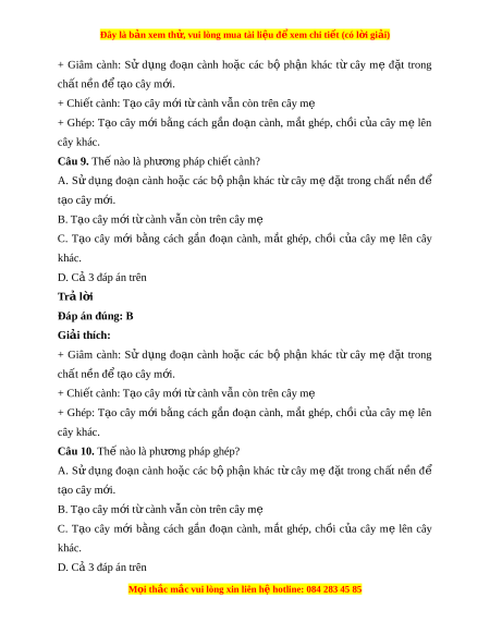Đây là bản xem th , vu ử i lòng mua tài li u ệ đ xe ể m chi ti t (c ế ó l i ờ gi i ả ) + Bư c 4: ớ Bôi ch t ấ kích thích ra rễ + Bư c 5: ớ Bao quanh v t ế c t ắ b ng gi ằ á thể + Bư c 6: ớ B c ọ kí b ng nyl ằ on Câu 7. Bư c t ớ h s ứ áu c a ủ quy trình chi t ế cành là: A. Bao quanh v t ế c t ắ b ng gi ằ á thể B. B c ọ kí b ng ằ nylon C. Bóc vỏ và c o s ạ ch ạ tư ng t ợ ng ầ D. Bôi ch t ấ kích thích ra rễ Trả l i ờ Đáp án đúng: B