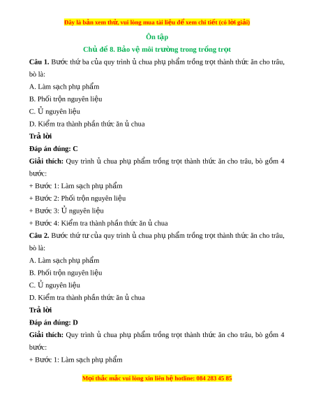 Đây là bản xem th , vu ử i lòng mua tài li u ệ đ xe ể m chi ti t (c ế ó l i ờ gi i ả ) Ôn tập Chủ đ 8. B ề ảo v m ệ ôi trư ng t ờ rong tr ng t ồ r t ọ Câu 1. Bư c ớ thứ ba c a ủ quy trình ủ chua ph ụ ph m ẩ tr ng ồ tr t ọ thành th c ứ ăn cho trâu, bò là: A. Làm sạch ph ph ụ m ẩ B. Ph i ố tr n nguyên l ộ i u ệ C. nguyên l Ủ i u ệ D. Ki m ể tra thành ph n t ầ h c ăn ứ ủ chua Trả l i ờ Đáp án đúng: C