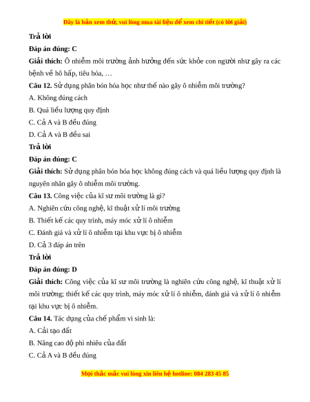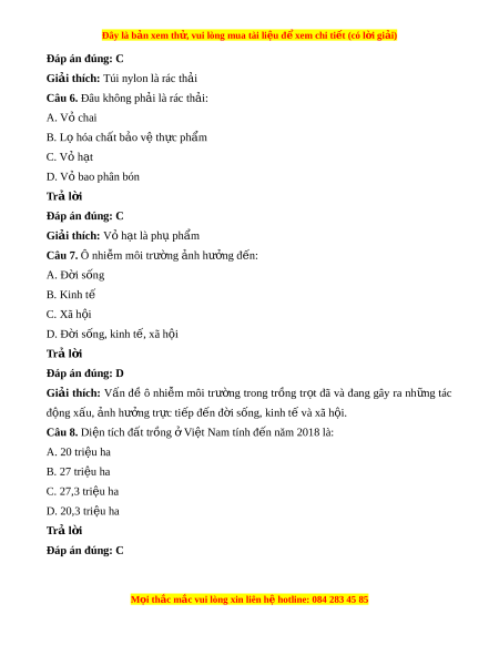 Câu 6. Đâu không ph i ả là rác th i ả : A. V chai ỏ B. L hóa ọ ch t ấ b o ả v t ệ h c ph ự m ẩ C. Vỏ h t ạ D. V bao phân ỏ bón Trả l i ờ Đáp án đúng: C Giải thích: V h ỏ t ạ là ph ph ụ m ẩ Câu 7. Ô nhi m ễ môi trư ng ờ nh ả hư ng đ ở n: ế A. Đ i ờ sống B. Kinh tế C. Xã h i ộ D. Đ i ờ sống, kinh t , xã h ế i ộ Trả l i ờ Đáp án đúng: D