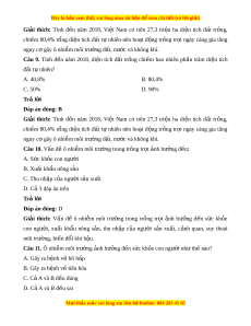 Giải thích: Vấn đề ô nhi m ễ môi trư ng ờ trong tr ng ồ tr t ọ nh ả hư ng ở đ n ế s c ứ kh e ỏ con ngư i ờ , xu t ấ kh u ẩ nông s n, ả thu nh p ậ c a ủ ngư i ờ s n ả xu t ấ , c nh ả quan, suy thoái môi trư ng, bi ờ n đ ế ổi khí h u. ậ Câu 11. Ô nhi m ễ môi trư ng ờ nh ả hư ng đ ở n s ế ức kh e con ỏ ngư i ờ nh t ư h nào? ế A. Gây ra b nh v ệ hô h ề p ấ B. Gây ra b nh v ệ t ề iêu hóa C. Cả A và B đ u đúng ề D. C ả A và B đ u s ề ai M i