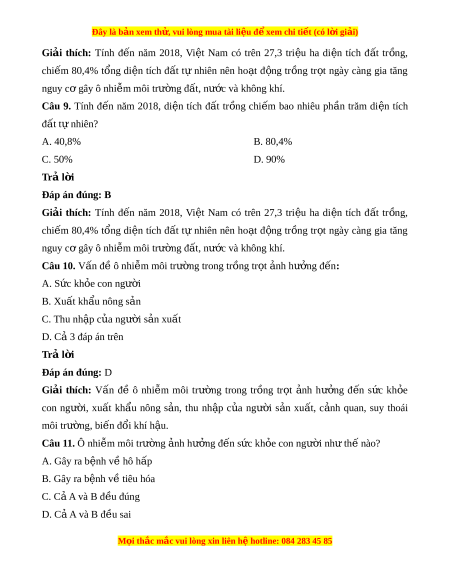 Giải thích: Tính đ n ế năm 2018, Vi t ệ Nam có trên 27,3 tri u ệ ha di n ệ tích đ t ấ tr ng, ồ chi m ế 80,4% t ng ổ di n ệ tích đ t ấ tự nhiên nên ho t ạ đ ng ộ tr ng ồ tr t ọ ngày càng gia tăng nguy cơ gây ô nhi m ễ môi trư ng ờ đ t ấ , nư c ớ và không khí. Câu 9. Tính đ n ế năm 2018, di n ệ tích đ t ấ tr ng ồ chi m ế bao nhiêu ph n ầ trăm di n ệ tích đất t nhi ự ên? A. 40,8% B. 80,4% C. 50% D. 90% Trả l i ờ Đáp án đúng: B