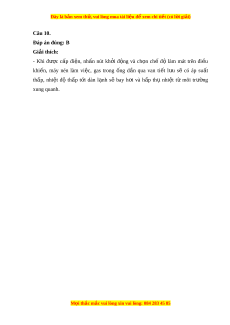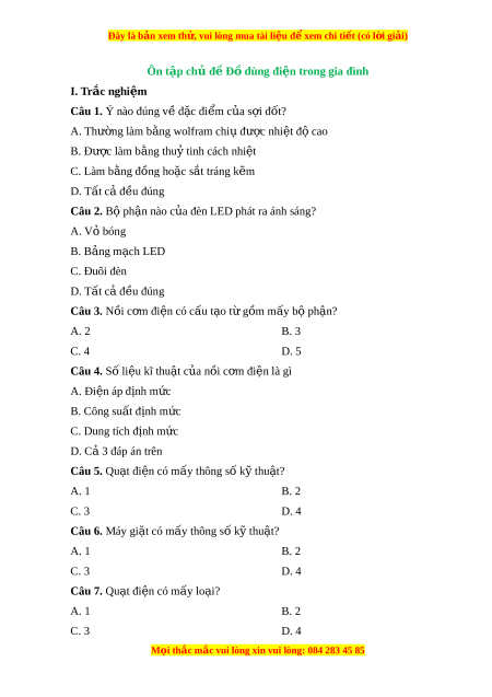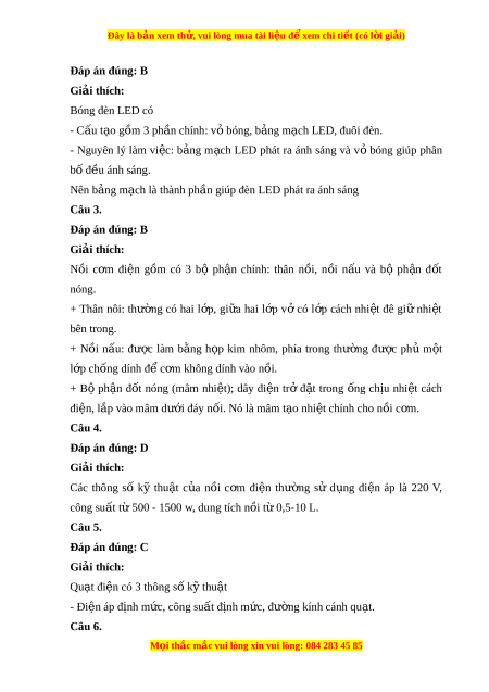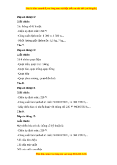 Đây là bản xem th , vu ử i lòng mua tài li u ệ đ xe ể m chi ti t ế (có l i ờ gi i ả ) Đáp án đúng: D Giải thích: Các thông số kĩ thu t ậ : - Điện áp định m c: ứ 220 V - Công suất đ nh m ị c: ứ 1 000 w, 1 500 w,„. - Khối lư ng gi ợ t ặ đ nh m ị c: ứ 6,5 kg, 7 kg,... Câu 7. Đáp án đúng: D Giải thích: Có 4 nhóm qu t ạ đi n: ệ - Qu t ạ tr n, qu ầ t ạ treo tư ng ờ - Qu t ạ bàn, qu t ạ đ ng, ứ qu t ạ l ng ử - Qu t ạ h p ộ - Qu t ạ phun sư ng, ơ qu t ạ đi u hoà ề Câu 8. Đáp án đúng: B Giải thích: - Điện áp định m c: ứ 220 V. - Công suất làm l nh đ ạ nh m ị c: