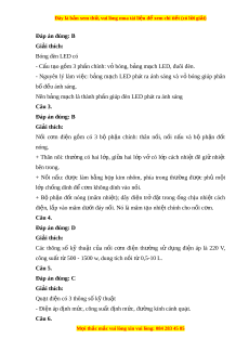 úp đèn LED phát ra ánh sáng Câu 3. Đáp án đúng: B Giải thích: N i ồ c m ơ đi n ệ g m ồ có 3 bộ ph n ậ chính: thân n i ồ , n i ồ n u ấ và bộ ph n ậ đ t ố nóng. + Thân nôi: thư ng ờ có hai l p, ớ gi a ữ hai l p ớ v ở có l p ớ cách nhi t ệ đê gi ữ nhi t ệ bên trong. + Nồi n u: ấ đư c ợ làm b ng ằ h p