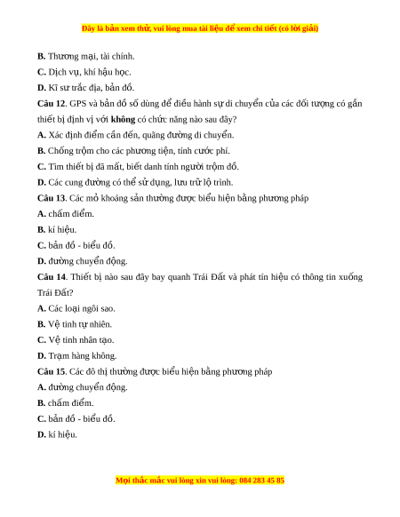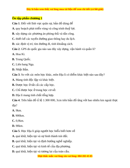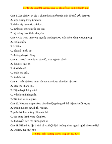 Đây là bản xem th , vu ử i lòng mua tài li u ệ đ xe ể m chi ti t (c ế ó l i ờ gi i ả ) Câu 6. Xác đ nh v ị t ị rí đ a ị lí c a ủ m t ộ đ a đi ị m ể trên b n đ ả ch ồ y ủ u d ế a ự vào A. hiện tư ng t ợ rong t nhi ự ên. B. đi m