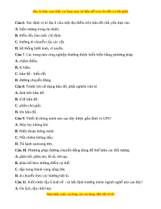 D. xác định vị trí; tìm đư ng ờ đi, tính kho ng ả cách. Câu 2. GPS do qu c gi ố a nào sau đây xây d ng, v ự n ậ hành và qu n ả lí? A. Hoa Kì. B. Trung Quốc. C. Liên bang Nga. D. Nh t ậ B n. ả Câu 3. So v i ớ các môn h c khác, m ọ ôn Đ a l ị í có đi m ể khác bi t ệ nào sau đây? A. Mang tính đ c l ộ p ậ và khác bi t ệ . B. Đư c h ợ c ọ t ở t ấ c các ả c p h ấ c. ọ C. Chỉ được h c ọ ở trung h c ọ c s ơ . ở