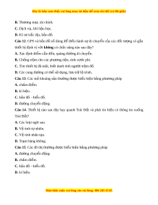 D. Kĩ sư trắc địa, b n ả đồ. Câu 12. GPS và b n ả đồ số dùng đ ể đi u ề hành s ự di chuy n ể c a ủ các đ i ố tư ng ợ có g n ắ thi t ế b đ ị nh v ị v ị i ớ không có ch c ứ năng nào sau đây? A. Xác đ nh đi ị m ể c n đ ầ n, ế quãng đư ng di ờ chuy n. ể B. Chống tr m ộ cho các phư ng ơ ti n, t ệ ính cư c ớ phí. C. Tìm thi t ế b đã m ị t ấ , bi t ế danh tính ngư i ờ tr m ộ đ . ồ D. Các cung đư ng ờ có th s ể ử d ng, l ụ u t ư r l ữ ộ trình.
