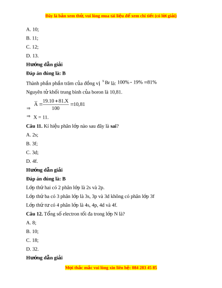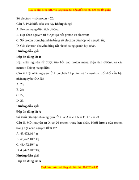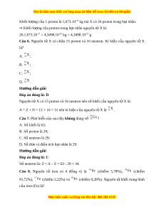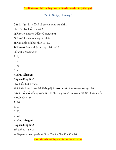Đây là bản xem th , vu ử i lòng mua tài li u ệ đ xe ể m chi ti t (c ế ó l i ờ gi i ả ) Bài 4: Ôn t p ch ậ ư ng ơ I Câu 1. Nguyên t X ử có 19 proton trong h t ạ nhân. Cho các phát bi u s ể au v X ề : 1) X có 19 electron l ở p v ớ ỏ nguyên t . ử 2) X có 19 neutron trong h t ạ nhân. 3) X có đi n t ệ ích h t ạ nhân là +19. 4) X có số đ n ơ v đi ị n t ệ ích h t ạ nhân là 19. Số phát bi u đúng l ể à? A. 1; B. 2; C. 3; D. 4. Hư ng d ớ ẫn gi i ả Đáp án đúng là: C Phát bi u 1, 3, 4 đúng. ể Phát bi u 2 s ể ai. Ch a ư th kh ể ng đ ẳ nh đ ị ư c ợ X có 19 neutron trong h t ạ nhân. Câu 2. Số kh i ố c a ủ nguyên t ử X là 56, trong đó s ố neutron là 30. S ố electron c a ủ nguyên tử X là? A. 26; B. 21; C. 22; D. 23. Hư ng d ớ ẫn gi i ả Đáp án đúng là: A Số khối A = Z + N ⇒ Số proton c a nguyên t ủ