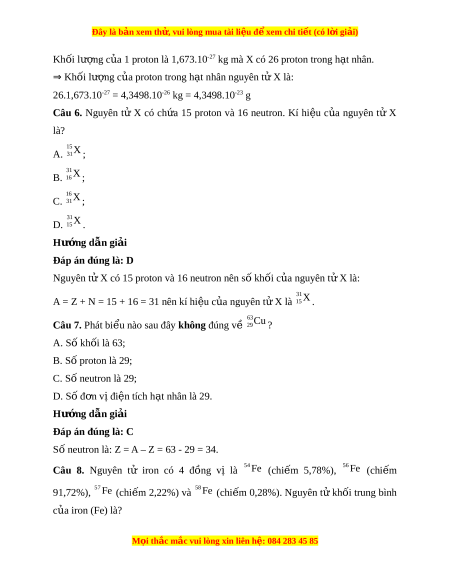 Câu 5. M t nguyên t X có 26 proton trong h t nhân. Kh i l ng c a protonộ ử ạ ố ượ ủ