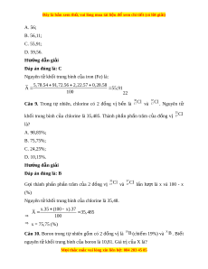 ủ chlorine là 35,485. Thành ph n ầ ph n ầ trăm c a ủ đ ng ồ vị Cl 17 là? A. 98,85%; B. 75,75%; C. 24,25%; D. 10,15%. Hư ng d ớ ẫn gi i ả Đáp án đúng là: B 35 37 G i ọ thành ph n ầ ph n ầ trăm c a ủ 2 đ ng ồ vị Cl Cl 17 và 17 l n ầ lư t ợ là x và 100 - x (%) Nguyên t kh ử ối trung bình c a chl ủ orine là 35,48. x.35 (100 x).37 A 3 5, 485 100 x = 75,75 (%)