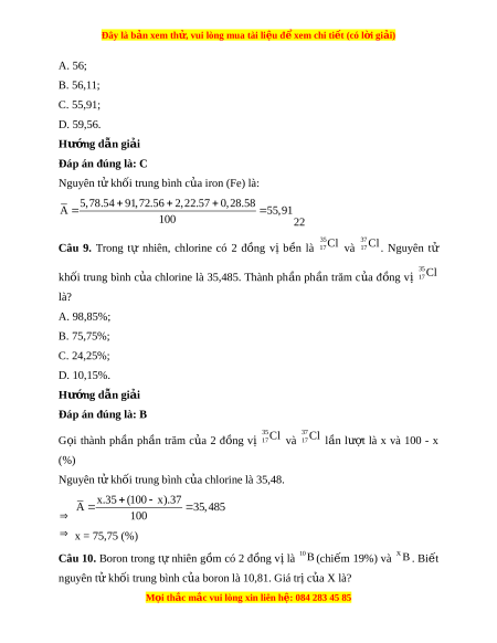 Đây là bản xem th , vu ử i lòng mua tài li u ệ đ xe ể m chi ti t (c ế ó l i ờ gi i ả ) A. 56; B. 56,11; C. 55,91; D. 59,56. Hư ng d ớ ẫn gi i ả Đáp án đúng là: C Nguyên t kh ử ối trung bình c a i ủ ron (Fe) là: