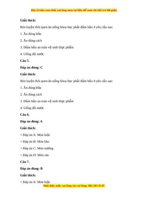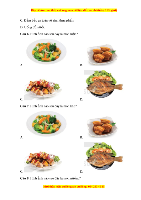 Đây là bản xem th , vu ử i lòng mua tài li u ệ đ xe ể m chi ti t ế (có l i ờ gi i ả ) C. Đ m ả b o an t ả oàn v s ệ inh th c ph ự m ẩ D. Uống đ n ủ ư c ớ Câu 6. Hình nh nào s ả au đây là món lu c? ộ A. B. C. D. Câu 7. Hình nh nào s ả au đây là món kho? A. B. C. D. Câu 8. Hình nh nào s ả au đây là món nư ng? ớ M i