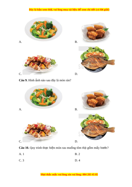 Đây là bản xem th , vu ử i lòng mua tài li u ệ đ xe ể m chi ti t ế (có l i ờ gi i ả ) A. B. C. D. Câu 9. Hình nh nào s ả au đây là món rán? A. B. C. D.