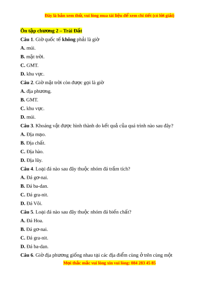 Đây là bản xem th , vu ử i lòng mua tài li u ệ đ xe ể m chi ti t (c ế ó l i ờ gi i ả ) Ôn t p ch ậ ư ng 2 – ơ Trái Đ t ấ Câu 1. Giờ quốc t ế không ph i ả là giờ A. múi. B. m t ặ tr i ờ . C. GMT. D. khu v c. ự Câu 2. Giờ m t ặ tr i ờ còn đư c g ợ i ọ là giờ A. địa phư ng. ơ B. GMT. C. khu v c. ự D. múi. Câu 3. Khoáng v t ậ đư c ợ hình thành do k t ế qu c ả a