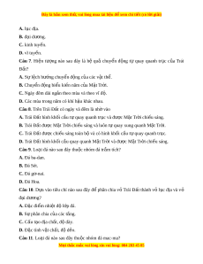 ế các mùa trong năm khác nhau. D. Chuy n ể đ ng các ộ v t ậ th b ể l ị ch h ệ ư ng. ớ Câu 13. Chuy n ể đ ng ộ tự quay quanh tr c ụ c a ủ Trái Đ t ấ không ph i ả là nguyên nhân chính gây nên hi n t ệ ư ng ợ A. khác nhau gi a các ữ mùa trong m t ộ năm. B. s l