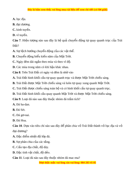 Đây là bản xem th , vu ử i lòng mua tài li u ệ đ xe ể m chi ti t (c ế ó l i ờ gi i ả ) A. l c ụ đ a. ị B. đ i ạ dư ng. ơ C. kinh tuy n. ế D. vĩ tuy n. ế Câu 7. Hi n ệ tư ng