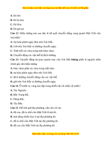 Câu 15. Để tính giờ địa phư ng, ơ c n căn c ầ vào ứ A. độ cao, đ t ộ o nh c ỏ a ủ M t ặ Tr i ờ n ở i ơ đó. B. ánh n ng nhi ắ u ề hay ít t i ạ đ a ph ị ư ng đó. ơ C. độ to nhỏ c a M ủ t ặ Tr i ờ t i ạ đ a ph ị ư ng ơ đó. D. độ cao c a M ủ t ặ Tr i ờ t i ạ địa phư ng ơ đó. M i ọ thắc m c