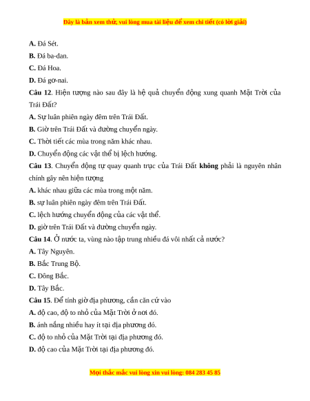 Đây là bản xem th , vu ử i lòng mua tài li u ệ đ xe ể m chi ti t (c ế ó l i ờ gi i ả ) A. Đá Sét. B. Đá ba-dan. C. Đá Hoa. D. Đá g - ơ nai. Câu 12. Hi n ệ tư ng