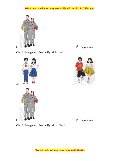 Đây là bản xem th , vu ử i lòng mua tài li u ệ đ xe ể m chi ti t ế (có l i ờ gi i ả ) C. D. Cả 3 đáp án trên Câu 5. Trang ph c nào ụ sau đây để đi ch i ơ ? A. B. C. D. Cả 3 đáp án trên Câu 6. Trang ph c nào ụ sau đây để lao đ ng? ộ M i