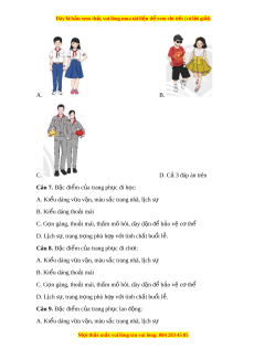 Đây là bản xem th , vu ử i lòng mua tài li u ệ đ xe ể m chi ti t ế (có l i ờ gi i ả ) A. B. C. D. Cả 3 đáp án trên Câu 7. Đ c ặ đi m ể c a t ủ rang ph c đi ụ h c: ọ A. Ki u dáng v ể a ừ v n, m ặ àu s c t ắ rang nhã, l ch s ị ự B. Ki u dáng ể tho i ả mái C. G n ọ gàng, tho i ả mái, th m ấ m hôi ồ , dày d n ặ đ b ể o v ả c ệ t ơ hể D. Lịch s , ự trang tr ng phù h ọ p ợ v i ớ tính ch t ấ bu i ổ l . ễ Câu 8. Đ c ặ đi m ể c a t ủ rang ph c đi ụ ch i ơ : A. Ki u dáng v ể a ừ v n, m ặ àu s c t ắ rang nhã, l ch s ị ự B. Ki u dáng ể tho i ả mái C. G n ọ gàng, tho i ả mái, th m ấ m hôi ồ , dày d n ặ đ b ể o v ả c ệ t ơ hể D. Lịch s , ự trang tr ng phù h ọ p ợ v i ớ tính ch t ấ bu i ổ l . ễ Câu 9. Đ c ặ đi m ể c a t ủ rang ph c l ụ ao đ ng: ộ A. Ki u dáng v ể a ừ v n, m ặ àu s c t ắ rang nhã, l ch s ị ự M i