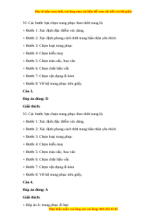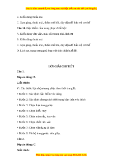 Đây là bản xem th , vu ử i lòng mua tài li u ệ đ xe ể m chi ti t ế (có l i ờ gi i ả ) B. Ki u dáng ể tho i ả mái C. G n ọ gàng, tho i ả mái, th m ấ m hôi ồ , dày d n ặ đ b ể o v ả c ệ t ơ hể Câu 10. Đ c ặ đi m ể c a t ủ rang ph c đi ụ l h ễ i ộ : A. Ki u dáng v ể a ừ v n, m ặ àu s c t ắ rang nhã, l ch s ị ự B. Ki u dáng ể tho i ả mái C. G n ọ gàng, tho i ả mái, th m ấ m hôi ồ , dày d n ặ đ b ể o v ả c ệ t ơ hể D. Lịch s , ự trang tr ng phù h ọ p ợ v i ớ tính ch t ấ bu i ổ l . ễ L I Ờ GIẢI CHI TI T Ế Câu 1. Đáp án đúng: B Giải thích: Vì: Các bước l a ch ự n ọ trang ph c ụ theo th i ờ trang là: + Bư c ớ 1: Xác đ nh đ ị c đi ặ m ể vóc dáng. + Bư c