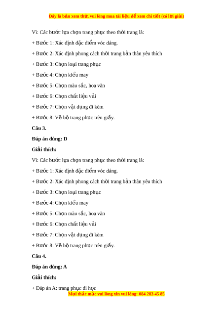 Đây là bản xem th , vu ử i lòng mua tài li u ệ đ xe ể m chi ti t ế (có l i ờ gi i ả ) ÔN TẬP CHƯ N Ơ G 3 Câu 1. Bư c ớ sáu trong quy trình l a ự ch n t ọ rang ph c t ụ heo th i ờ trang là: A. Ch n ọ màu s c, ắ hoa văn B. Ch n ọ ch t ấ li u v ệ i ả C. Ch n ọ v t ậ d ng đi ụ kèm D. Vẽ bộ trang ph c ụ trên gi y ấ . Câu 2. Bư c ớ th b ứ y t ả rong quy trình l a ự ch n t ọ rang ph c t ụ heo th i ờ trang là: A. Ch n ọ màu s c, ắ hoa văn B. Ch n ọ ch t ấ li u v ệ i ả C. Ch n ọ v t ậ d ng đi ụ kèm D. Vẽ bộ trang ph c ụ trên gi y ấ . Câu 3. Bư c ớ th t