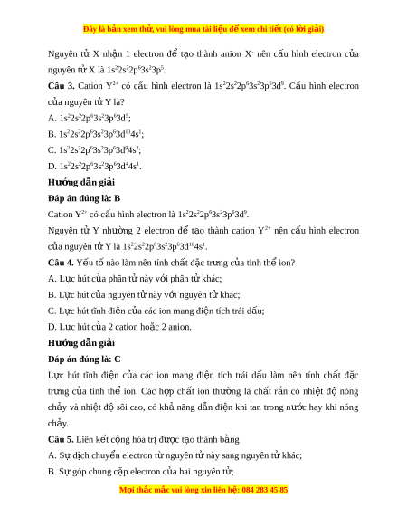 Đây là bản xem th , vu ử i lòng mua tài li u ệ đ xe ể m chi ti t (c ế ó l i ờ gi i ả ) Nguyên tử X nh n ậ 1 electron để t o ạ thành anion X- nên c u ấ hình electron c a ủ