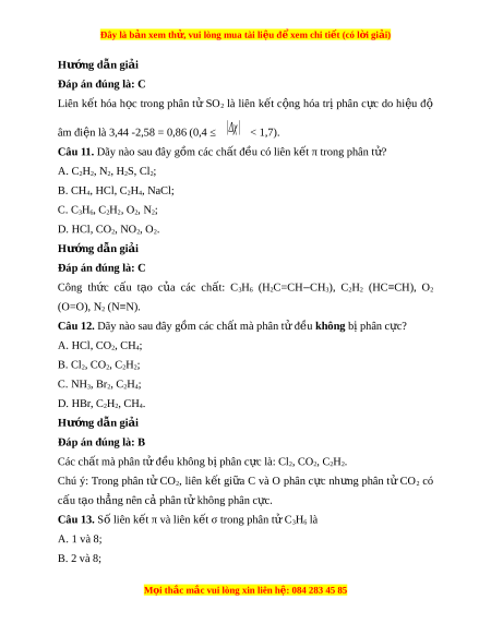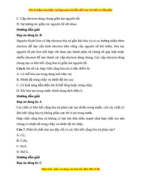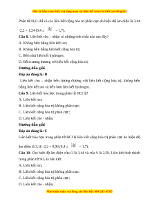 Câu 6. Đa số các h p ch ợ t ấ c ng ộ hóa tr có đ ị c ặ đi m ể là: A. Có th hòa t ể an trong dung môi h u ữ c ; ơ B. Nhi t ệ độ nóng ch y và ả nhi t ệ đ s ộ ôi cao; C. Có khả năng d n đ ẫ i n khi ệ t ở hể l ng ho ỏ c nóng ch ặ y; ả D. Khi hòa tan trong nư c ớ thành dung d ch đi ị n l ệ i. Hư ng d ớ ẫn gi i ả Đáp án đúng là: A Các ch t ấ có liên k t ế c ng ộ hóa tr ịphân c c ự tan nhi u ề trong nư c, ớ còn các ch t ấ có liên k t ế c ng ộ hóa tr không phân c ị c ự thì ít tan trong nư c. ớ H p ợ ch t ấ c ng ộ hóa trị không có l c ự hút tĩnh đi n ệ m nh ạ như h p ợ ch t ấ ion nên chúng có nhi t ệ độ nóng ch y và nhi ả t ệ đ s ộ ôi th p. ấ Câu 7. Phân t ch ử t ấ nào sau đây ch có các ỉ liên k t ế c ng hóa t ộ r phân c ị c? ự A. Cl2; B. C3H8; C. H2O; D. BaCl2. Hư ng d ớ ẫn gi i ả Đáp án đúng là: C M i