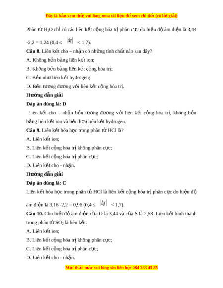 Đây là bản xem th , vu ử i lòng mua tài li u ệ đ xe ể m chi ti t (c ế ó l i ờ gi i ả ) Phân tử H2O ch ỉ có các liên k t ế c ng ộ hóa tr phân ị c c ự do hi u ệ đ âm ộ đi n ệ là 3,44