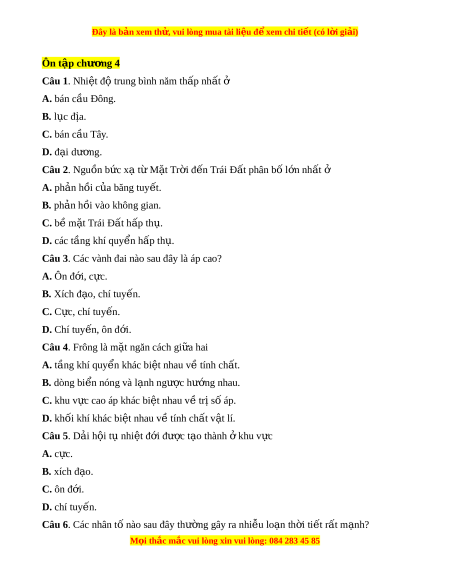 Đây là bản xem th , vu ử i lòng mua tài li u ệ đ xe ể m chi ti t (c ế ó l i ờ gi i ả ) Ôn t p ch ậ ư ng 4 ơ Câu 1. Nhi t ệ đ t ộ rung bình năm th p nh ấ t ấ ở A. bán cầu Đông. B. l c đ ụ ịa. C. bán cầu Tây. D. đ i ạ dư ng. ơ Câu 2. Nguồn b c x ứ ạ t M ừ t ặ Tr i ờ đ n ế Trái Đ t ấ phân b l ố n nh ớ t ấ ở A. ph n ả hồi c a ủ băng tuy t ế . B. ph n h ả ồi vào không gian. C. b m ề t ặ Trái Đất h p t ấ h . ụ