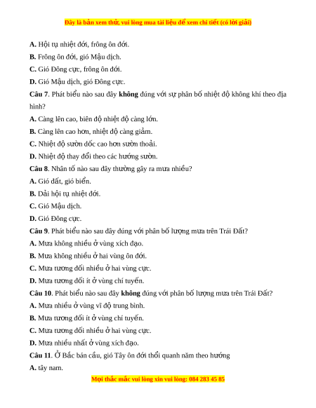 Đây là bản xem th , vu ử i lòng mua tài li u ệ đ xe ể m chi ti t (c ế ó l i ờ gi i ả ) A. H i ộ t nhi ụ t ệ đ i ớ , frông ôn đ i ớ . B. Frông ôn đ i ớ , gió M u d ậ ch. ị C. Gió Đông c c, ự frông ôn đ i ớ . D. Gió M u d ậ ịch, gió Đông c c. ự Câu 7. Phát bi u