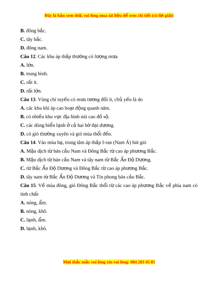 A. các khu khí áp cao ho t ạ đ ng quanh năm ộ . B. có nhi u khu v ề c đ ự ịa hình núi cao đồ s . ộ C. các dòng bi n l ể nh ạ ở c hai ả bờ đ i ạ dư ng. ơ D. có gió thư ng ờ xuyên và gió mùa th i ổ đ n. ế Câu 14. Vào mùa h , ạ trung tâm áp th p I ấ -ran (Nam Á) hút gió A. M u d ậ ịch t bán c ừ ầu Nam và Đông B c ắ t cao áp ph ừ ư ng ơ B c. ắ B. M u ậ dịch t bán c ừ u N ầ am và tây nam t B ừ c ắ n Đ Ấ D ộ ư ng. ơ C. t B ừ c ắ n Ấ Đ D ộ ư ng và ơ Đông B c ắ t cao áp ph ừ ư ng ơ B c. ắ D. tây nam từ B c ắ n Đ Ấ D ộ ư ng ơ và Tín phong bán c u B ầ c. ắ