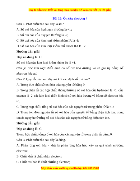 Câu 1. Phát bi u nào s ể au đây là sai? A. Số oxi hóa c a hydr ủ ogen thư ng ờ là +1; B. Số oxi hóa c a ủ oxygen thư ng ờ là -2; C. Số oxi hóa c a ủ kim lo i ạ ki m ề nhóm IA là -1; D. Số oxi hóa c a ki ủ m lo i ạ ki m ề th nhóm ổ IIA là +2. Hư ng d ớ ẫn gi i ả Đáp án đúng là: C Số oxi hóa c a ki ủ m lo i ạ ki m ề nhóm IA là +1.