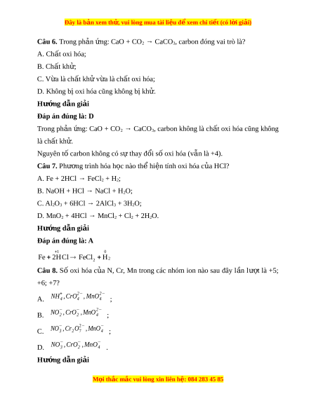 Nguyên tố carbon không có sự thay đổi số oxi hóa (v n l ẫ à +4). Câu 7. Phư ng ơ trình hóa h c ọ nào th hi ể n t ệ ính oxi hóa c a ủ HCl? A. Fe + 2HCl → FeCl2 + H2; B. NaOH + HCl → NaCl + H2O;