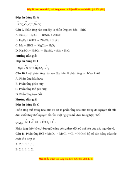 Mg+2 H Cl→ Mg Cl2+H2 Câu 10. Lo i ạ ph n ả ng nào s ứ au đây luôn là ph n ả ng ứ oxi hóa - kh ? ử A. Ph n ả ng hóa h ứ p; ợ B. Ph n ả ng phân h ứ y; ủ C. Ph n ả ng t ứ h ( ế vô c ) ơ ; D. Ph n ả ng t ứ rao đ i ổ . Hư ng d ớ ẫn gi i ả Đáp án đúng là: C Ph n ả ng ứ thế trong hóa h c ọ vô cơ là ph n ả ng ứ hóa h c