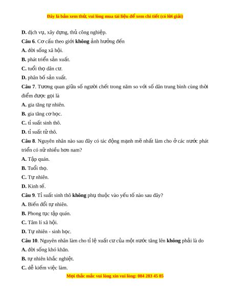 Đây là bản xem th , vu ử i lòng mua tài li u ệ đ xe ể m chi ti t (c ế ó l i ờ gi i ả ) Ôn t p ch ậ ư ng 8 ơ Câu 1. Ở Trung Qu c ố tỉ lệ gi i ớ nam l n ớ h n ơ gi i ớ n ữ là do nguyên nhân ch ủ y u ế nào sau đây? A. Tâm lý xã h i ộ . B. Tuổi th n ọ cao. ữ C. Chi n ế tranh. D. Chuy n ể c . ư Câu 2. K t