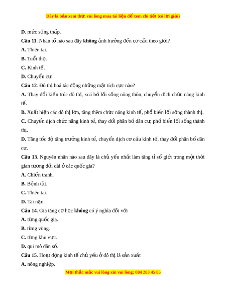 Câu 11. Nhân tố nào sau đây không nh h ả ư ng ở đ n c ế c ơ u t ấ heo gi i ớ ? A. Thiên tai. B. Tuổi th . ọ C. Kinh t . ế D. Chuy n ể c . ư Câu 12. Đô th hoá t ị ác đ ng ộ nh ng m ữ t ặ tích c c ự nào? A. Thay đ i ổ ki n ế trúc đô th ,ị xoá b ỏ l i ố s ng ố nông thôn, chuy n ể d ch ị ch c ứ năng kinh t . ế B. Xuất hi n các ệ đô th l ị n, ớ tăng thêm ch c năng ki ứ nh t , ph ế bi ổ n l ế i ố s ng t ố hành th . ị C. Chuy n ể d ch ị ch c ứ năng kinh t , ế thay đ i ổ phân b ố dân c , ư ph ổ bi n ế l i ố s ng ố thành thị. D. Tăng tốc đ ộ tăng trư ng ở kinh t , ế chuy n ể d ch ị c ơ c u ấ kinh t , ế thay đ i ổ phân b dân ố c . ư
