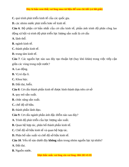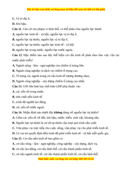 C. Vị trí đ a ị lí. D. Khí h u. ậ Câu 11. Căn c vào ph ứ m ạ vi lãnh th , có ổ th phân chi ể a ngu n l ồ c t ự hành A. nguồn l c ki ự nh t - ế xã h i ộ , ngu n l ồ c v ự t ị rí đ a l ị í. B. nguồn l c ự t nhi ự ên, nguồn l c v ự t ị rí đ a l ị í. C. nguồn l c t ự nhi ự ên, nguồn l c ki ự nh t - ế xã h i ộ . D. nguồn l c t ự rong nư c, ngu ớ n l ồ c n ự ư c ớ ngoài. Câu 12. Đặc đi m ể nào sau đây thể hi n ệ cơ c u