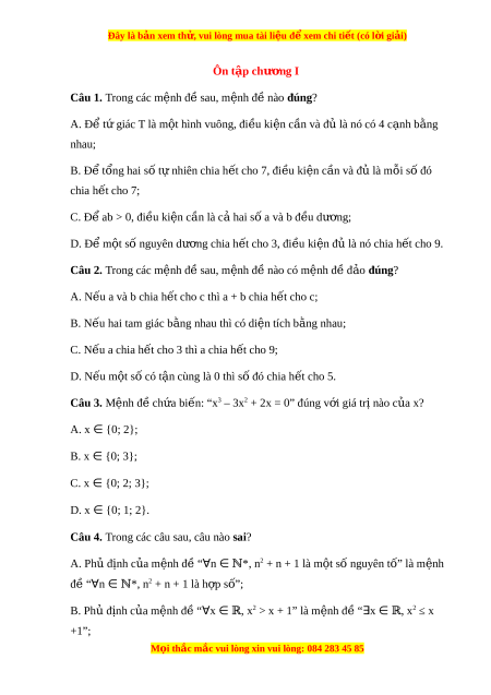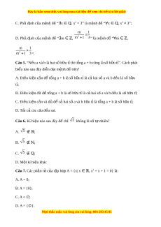 Đây là bản xem th , vu ử i lòng mua tài li u ệ đ xe ể m chi ti t (c ế ó l i ờ gi i ả ) C. Ph đ ủ nh c ị a ủ m nh đ ệ “ ề ∃x ∈ , x ℚ 2 = 3” là m nh đ ệ “ ề ∀x ∈ , x ℚ 2 ≠ 3”; m 1 D. Ph đ ủ nh c ị a ủ m nh đ ệ ề “∃m ∈ , ℤ 2 m 1 3 ” là mệnh đ “ ề ∀m ∈ , ℤ m 1 2 m 1 3 ”. Câu 5. “N u ế a và b là hai số h u ữ t t ỉ hì t ng a + b cũng l ổ à s h ố u t ữ ”. C ỉ ách phát bi u nào ể sau đây di n đ ễ t ạ mệnh đ t ề rên? A. Đi u ề ki n c ệ n đ ầ t ể ng a + b l ổ à s h ố u t ữ l ỉ à c hai ả s a và b đ ố u ề là s h ố u ữ tỉ; B. Đi u ki ề n đ ệ đ ủ t ể ng a + b l ổ à s h ố u t ữ l ỉ à c hai ả s a và b đ ố u l ề à s h ố u ữ t ; ỉ C. Đi u ki ề n c ệ n và đ ầ đ ủ c ể ả hai s a và b h ố u t ữ l ỉ à tổng a + b là s h ố u t ữ ; ỉ D. Tất cả các câu đ u s ề ai. Câu 6. Kí hi u nào s ệ au đây đ ch ể ỉ 5 không là số t nhi ự ên? A. 5 ∉ ; ℝ B. 5 ∉ ; ℕ C. 5 ∉ ; ℚ D. M t ộ kí hi u khác ệ Câu 7. Các ph n t ầ c ử a t ủ p ậ h p ợ A = {x| x ∈ , x ℝ 2 + x + 1 = 0} là: A. A = 0; B. A = {0}; C. A = ∅; D. A = {∅}. M i ọ thắc m c