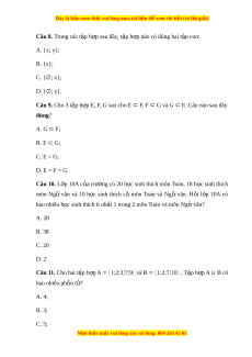 , F, G sao cho E ⊂ F, F ⊂ G và G ⊂ E. Câu nào sau đây đúng? A. G ⊂ F; B. E ⊂ G; C. E = G; D. E = F = G. Câu 10. L p ớ 10A c a ủ trư ng ờ có 20 h c