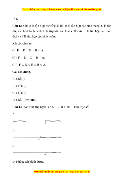 (III). F ⊂ D ⊂ E ⊂ B ⊂ A. Câu nào đúng? A. Chỉ (I); B. Ch ( ỉ II); C. Ch ( ỉ III); D. Chỉ (II) và (III). Câu 13. Xác đ nh t ị p ậ h p: ợ B = (7; 12] ∪ ( ∞ ‒ ; 9] trên tr c s ụ : ố A. B. C. D. Không xác đ nh đ ị ư c. ợ M i ọ thắc m c